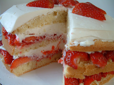 - Gently spread about one-third of whipped cream (about 1 1/2 cups) over berry layer, leaving 1/2-inch border from edge.Place middle cake layer on top and press down gently (whipped cream layer should become flush with cake edge).Repeat with 20 additional strawberry halves, remaining berry mixture, and half of remaining whipped cream; gently press last cake layer on top.Spread remaining whipped cream over top; decorate with remaining cut strawberries.