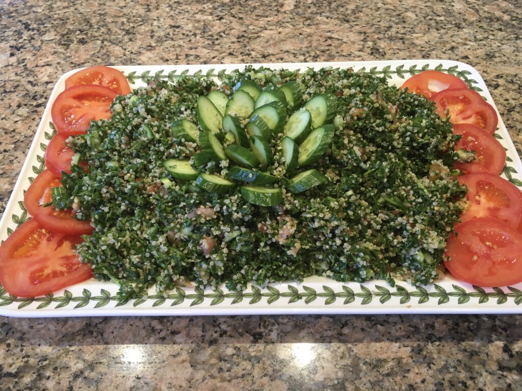 - Assemble the salad: Place the quinoa in a large bowl and add the parsley, cilantro, mint, cucumbers, tomatoes, and scallions and toss to combine. Add the oil, lemon juice, salt, and pepper and serve